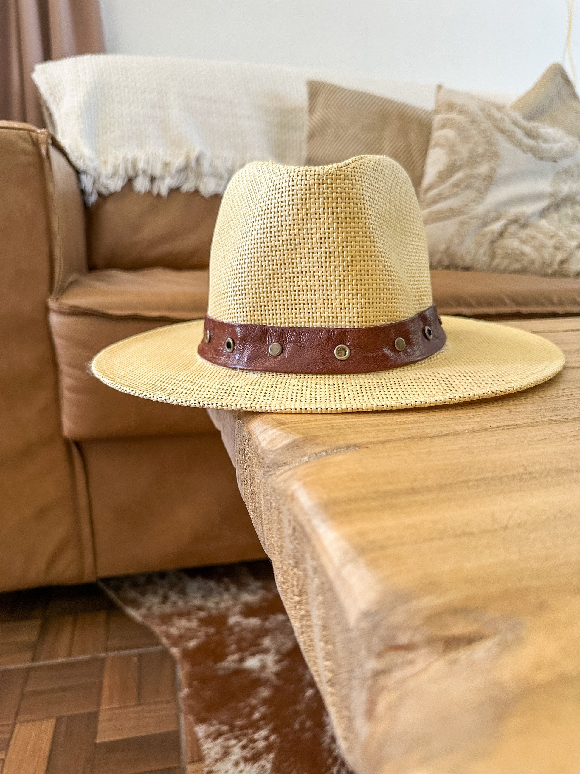 Sombrero intervenido artesanalmente, trabajado con detalles en cuero y accesorios seleccionados como nácar, guampa y pins, que aportan carácter y hacen única a cada pieza.